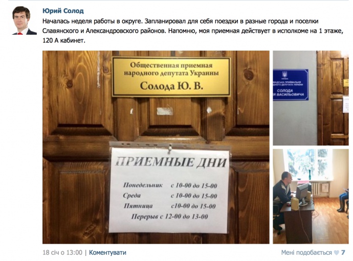 На вопрос в фейсбуке, можно ли попасть к нему на прием, Солод (или человек, который ведет его страницу) ответил предложением организовать встречу. На возражение, что нас интересует его работа именно с гражданами, а не с журналистами, ответа так и не последовало.
