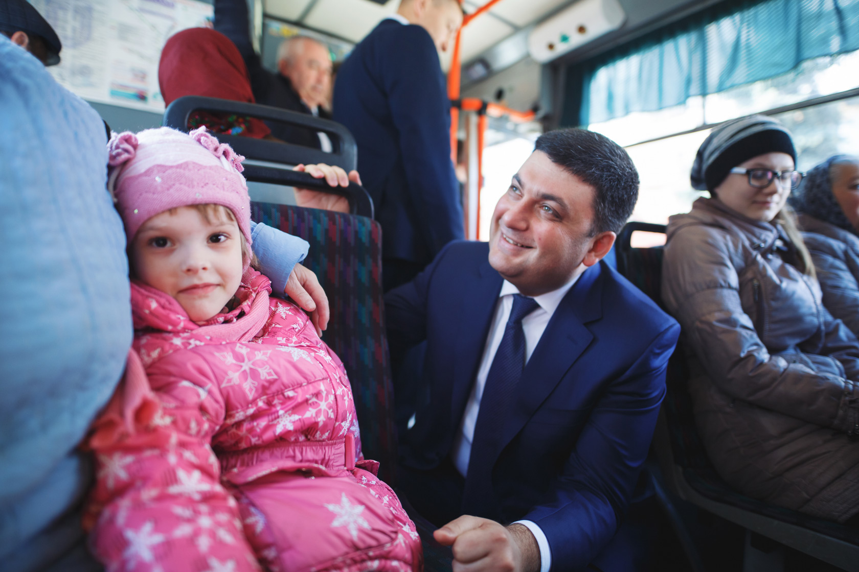Гройсман пытается познакомиться с 5-летней девчушкой в розовой куртке и шапке, которая едет вместе с бабушкой. Но на вопросы как ее зовут, девочка упорно молчит.