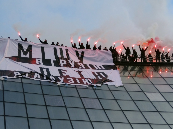 Около 12:40 они начали разворачивать на стеклянном фасаде ТЦ "Глобус" большой плакат с надписью "Мішу в Грузію, Пєтю – в Гагаузію".
