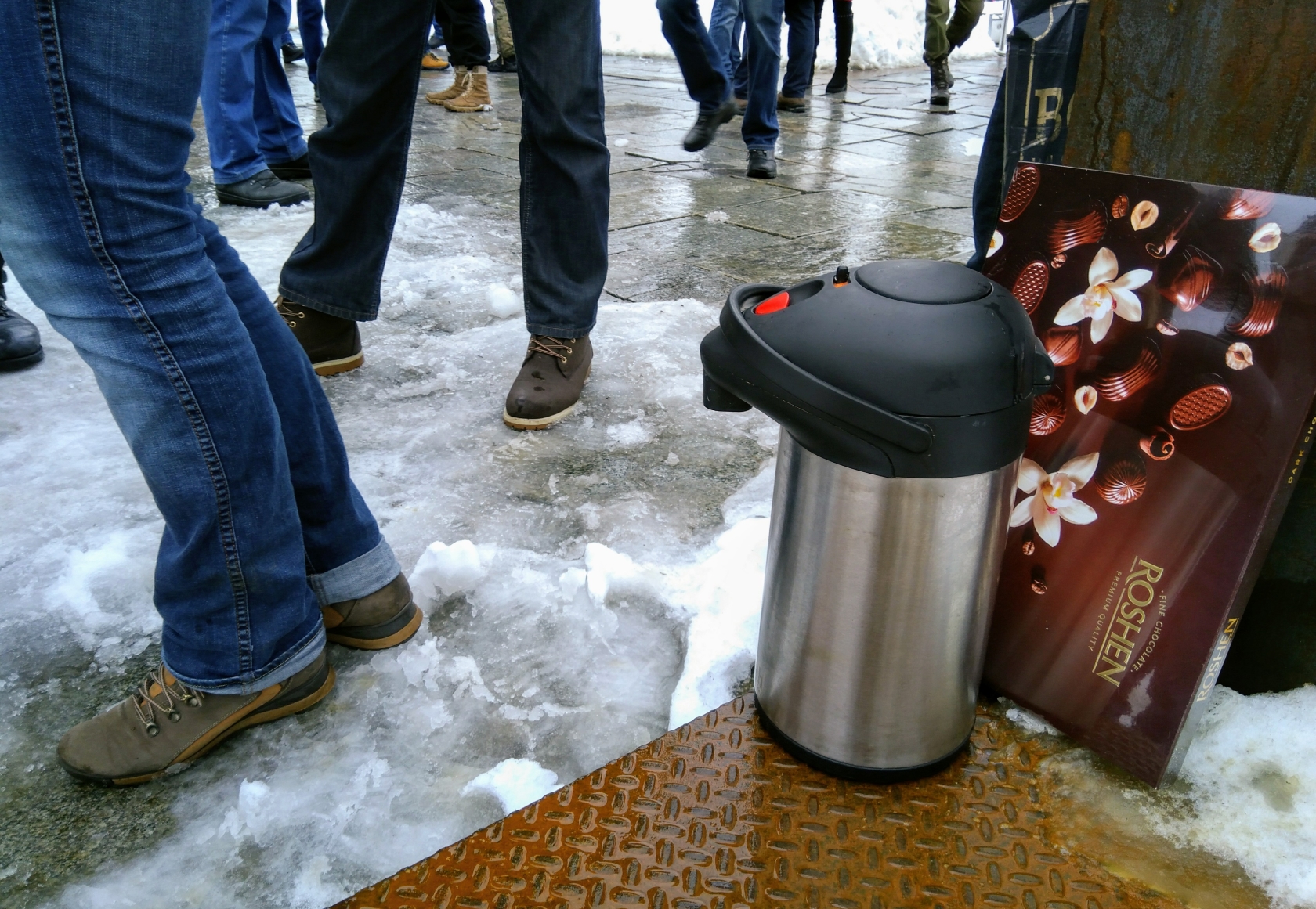 Главными звездами "кофеМайдана" стали внештатный советник президента Юрий Бирюков и автор мероприятия Алексей Петров. К ним постоянно подходили люди, наливали из термосов, делали селфи на память.