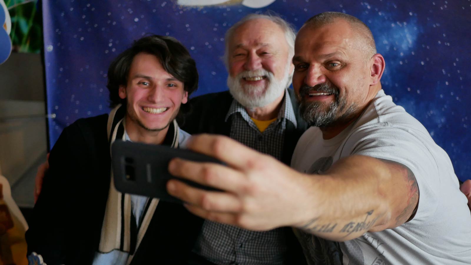 – Так, підходьте по черзі з цієї сторони! – командує він. – Давайте мені ваші смартфони. Я сам все зроблю, в мене рука набита на селфі. Не хвилюйтесь, всі попадуть в кадр. Наступні!