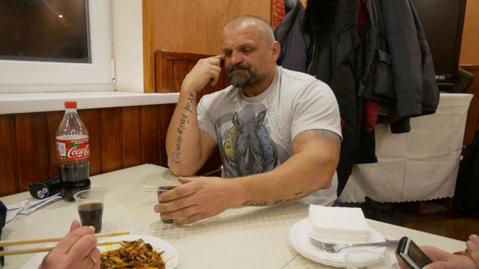 Вірастюкам подобається місцева кухня. На цей раз вони беруть свинячі вуха, рис і гунбао – курку з овочами й арахісом. Гріючись пекучими стравами, Василь ділиться минулим.