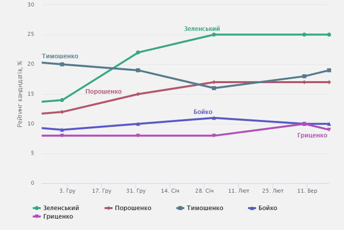 Менше ніж за тиждень до виборів ключові соціологічні служби опублікували свіжі дослідження, де чітко простежується відрив Володимира Зеленського. Петро Порошенко та Юлія Тимошенко відстають від лідера гонки на 10 відсотків та дихають одне одному у спину.
