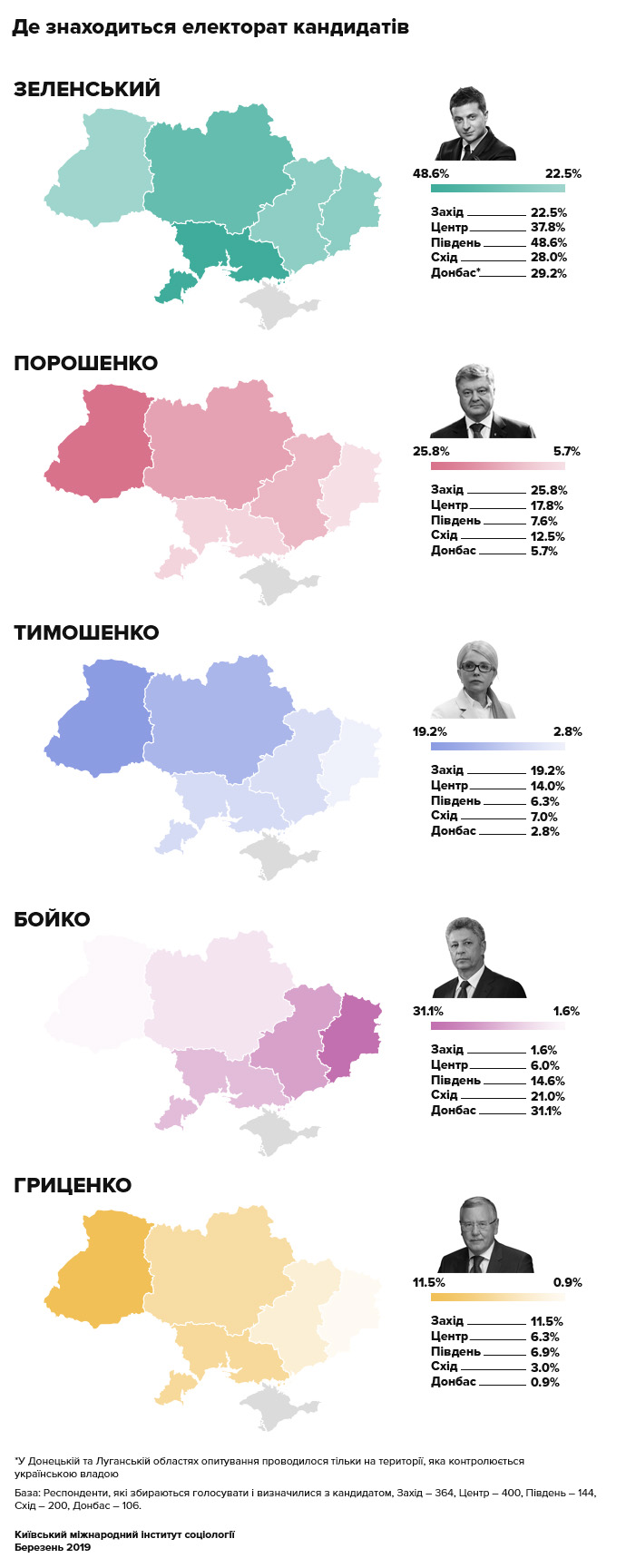 Найбільше прихильників Зеленського проживають на півдні та у центрі держави; Порошенка й Тимошенко – на західній Україні й у центрі; Гриценка – на заході; Бойка – на сході.
