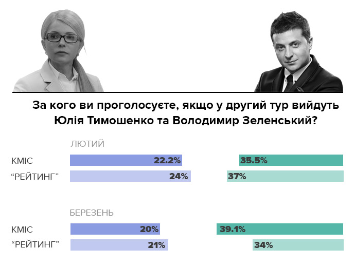 Проте Зеленський здобуває першість як у парі з Порошенком з результатом 39% проти 18%, так і з Тимошенко – 34% проти 21%.