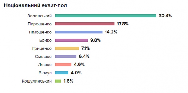 Згідно остаточних даних Національного екзит-полу (на 20:00) шоумен Володимир Зеленський набирає 30,6%, чинний президент Петро Порошенко – на другому місці з результатом 17,8%, лідер "Батьківщини" Юлія Тимошенко має 14,2% підтримки.
