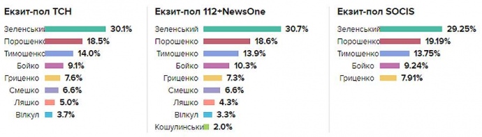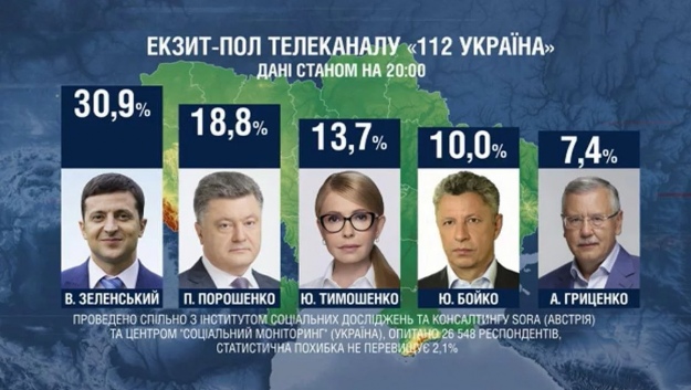 За даними екзитполу на замовлення каналів "112 Україна" і NewsOne на 20:00, Зеленського підтримали 30,9% опитаних, Порошенка – 18,8%, Тимошенко – 13,7%.