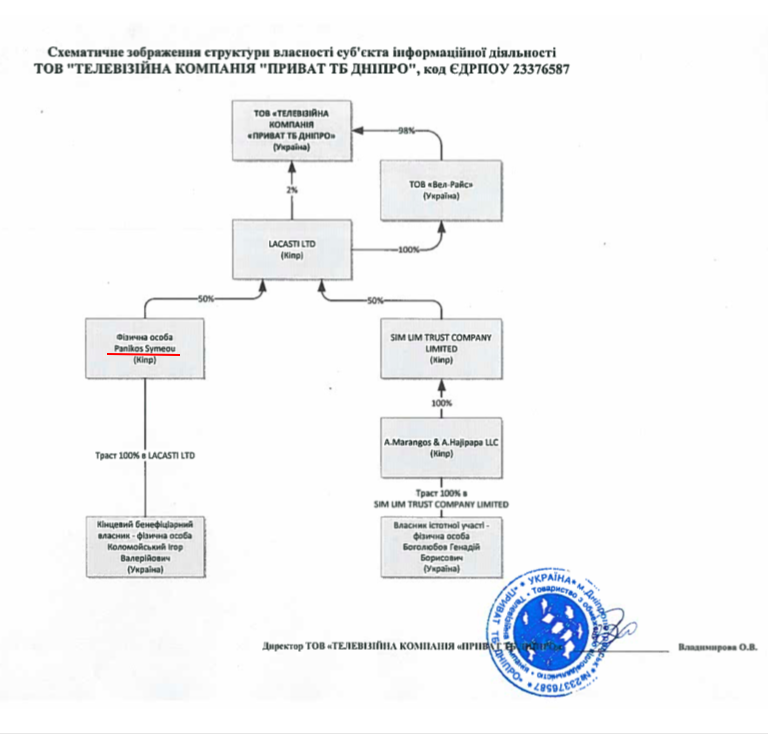 Дуже чітко роль кіпріота простежується у структурі власності дніпропетровського телеканалу ТЕЛЕКОМПАНІЯ "ПРИВАТ ТБ ДНІПРО". Тут Симеу – довірена особа Коломойського, через яку олігарх володіє каналом.