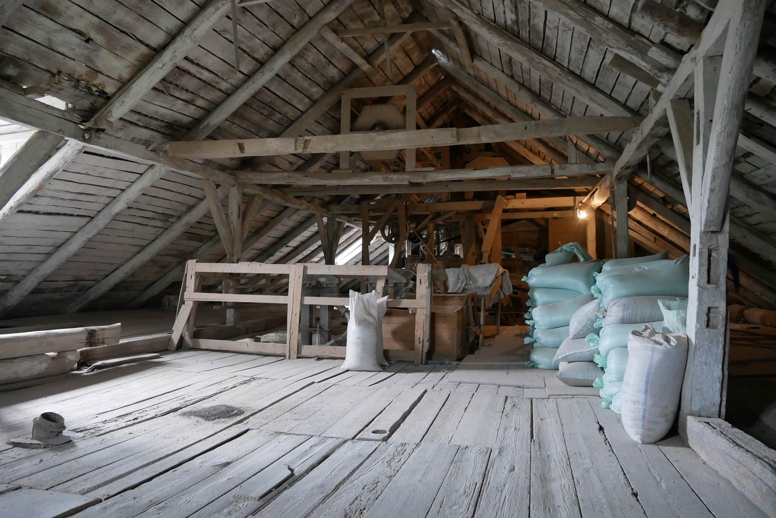 Внутри мельницы преобладают белые цвета, запах муки, пыли и сырости
