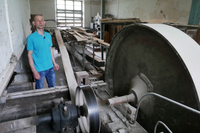 – Це турбіна – серце водяного млина, – подводит он к тяжелому валу, который приводит в действие только лишь напор Збруча. – Зараз я знімаю турбіну з тормоза. Вал запускається через поштовх води та набирає обороти.