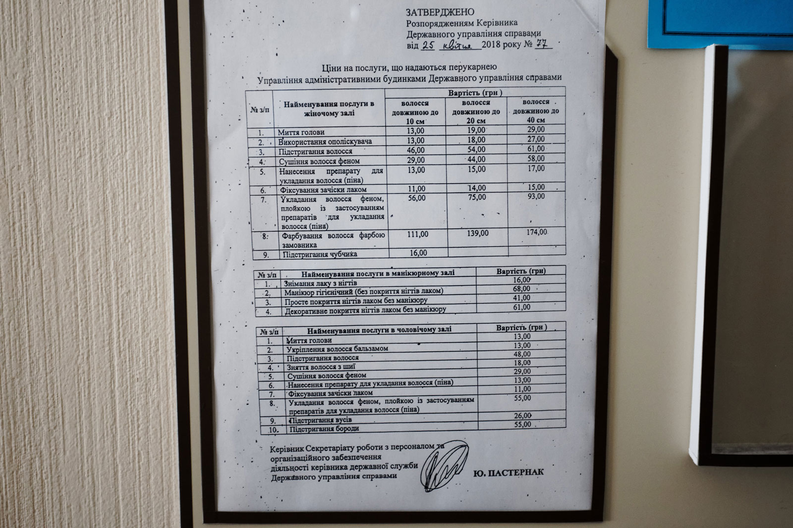 Неподалік, у тому ж приміщенні, що і їдальня, розташована перукарня, де стрижуть працівників АП.