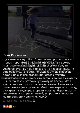 Того дня, коли вбили Павла Шеремета, Кузьменко, судячи з соцмереж, була у відпустці, в Києві. А 21 липня ходила на концерт Андрія Антоненка.