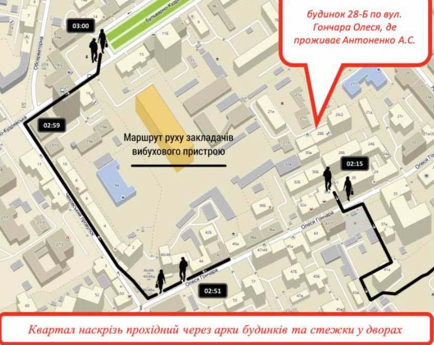 Слідство звертає увагу на адресу Антоненка на вулиці Олеся Гончара. Його будинок розташований за 10 хвилин пішки від будинку Шеремета і приблизно на такій же відстані від місця, де вбивць востаннє зафіксували камери. Всі ці три точки розташовані у межах 3 кварталів.