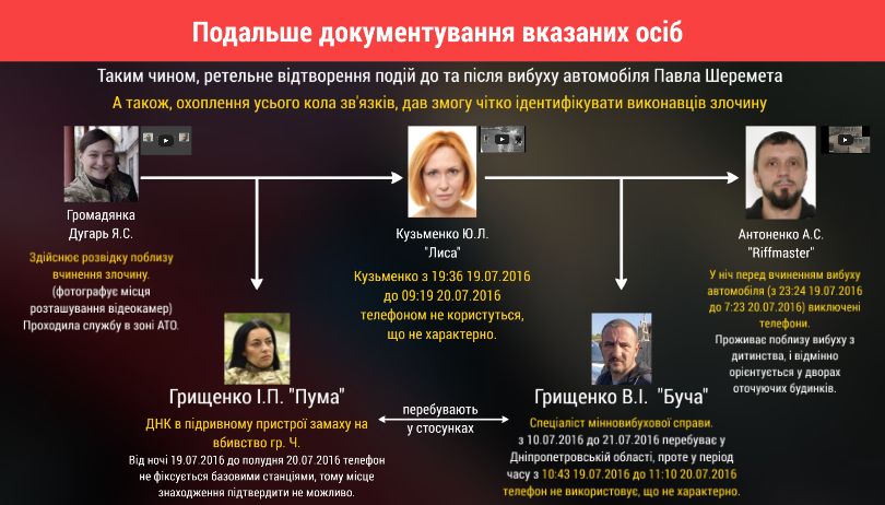Версія слідства: Владислав Грищенко як професійний сапер нібито зробив вибухівку. Як для вбивства Шеремета, так і для іншого злочину. Ці два пристрої були майже ідентичними. На одному з них, який готували не для вбивства Шеремета, знайшли ДНК Владислава