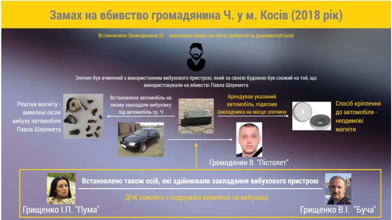 Йдеться про подружжя добровольців Грищенків: Владислава (Бучу), затриманого у вересні, та Інну (Пуму), затриману на початку листопада. Їх підозрюють у спробі іншого вбивства, яке так і не відбулось. Подружжя разом із другом, теж АТОвцем, влітку 2018 року нібито зробило і підклало вибухівку під автівку івано-франківського кримінального авторитета.