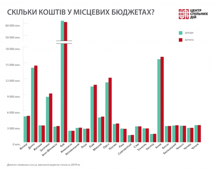 Найбільші міста України теж оперують великими бюджетами. Наприклад, Київ станом на сьогодні запланував доходів на 58 млрд гривень, а видатків – майже 62,5 млрд, Харків – 14,5 та 16 млрд відповідно, Дніпро – 13 та 14 млрд, Львів – 10 та 11 млрд, Одеса – по 10,5 млрд.
