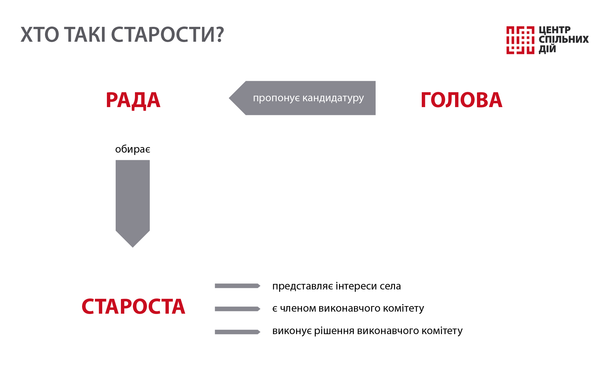 Особливістю нового адміністративно-територіального устрою є те, що села і селища, які входять до складу територіальної громади, мають старост. Це посадові особи, які представляють інтереси жителів села чи селища у виконкомі ради громади, стежать за благоустроєм, реалізують рішення ради громади та її виконкому тощо.