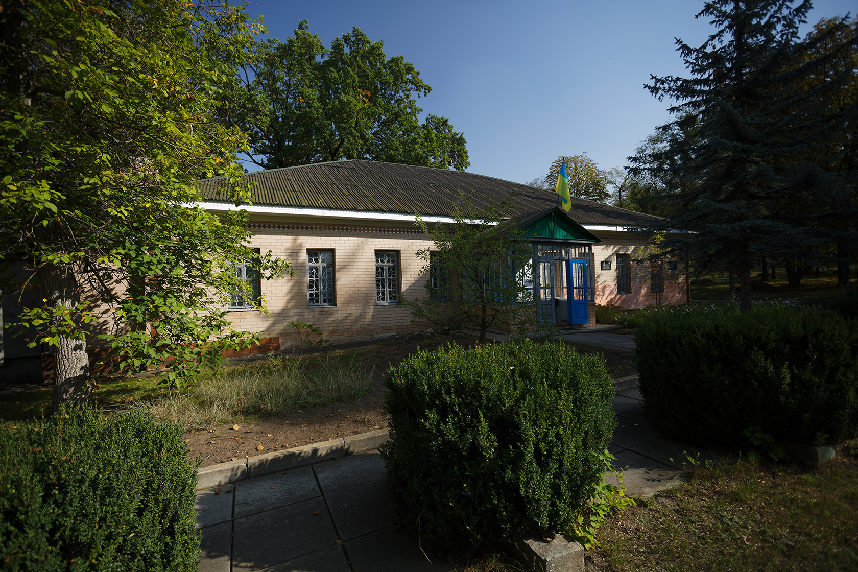 Двухэтажное здание, похожее на дворец. Напротив него – величественный памятник Льву Симиренко. Правой рукой он показывает на фасад, в левой держит ветку яблони.