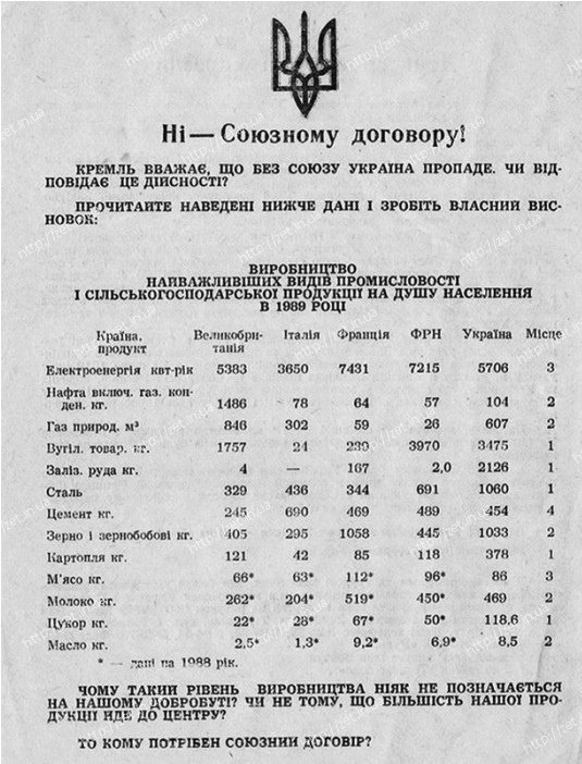 Листовки сообщали, что Украина находится на первых местах в СССР по производству на душу населения зерна, мяса, растительного масла, молока, чугуна, проката, труб и станков.