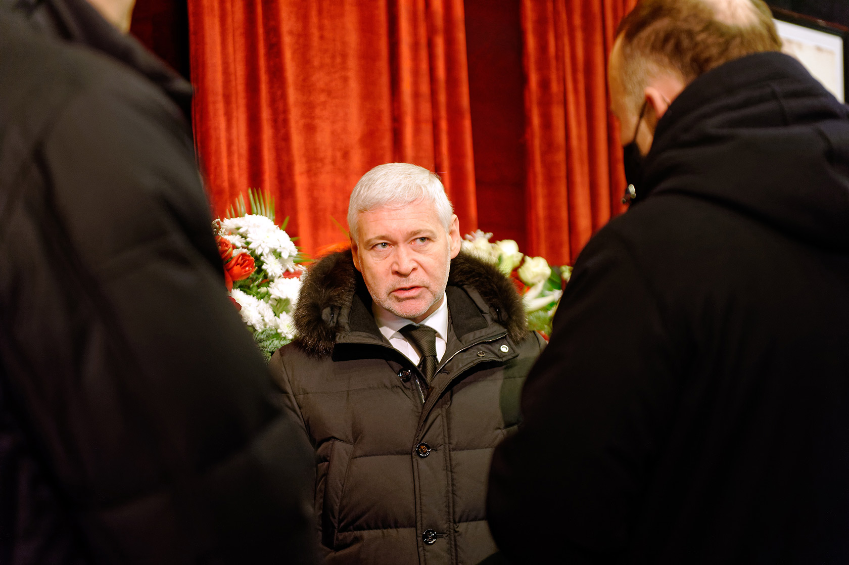 В боковых дверях появляется экс-глава облсовета Сергей Чернов и другие чиновники областного управления. Очередь от главного входа становится все плотнее, у гроба возникает пробка.