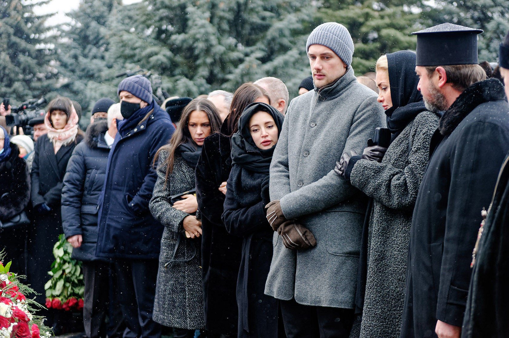 Ближе к 9 у гроба появляются еще один сын мэра Даниил Привалов, пасынок Родион Гайсинский и Оксана Гайсинская. На голове у нее — черный платок. Родион — в перчатках. У гроба в несколько рядов стоят стулья. Семья мэра занимает первый и второй ряды, Кличко усаживается в четвертый, Фукс продолжает стоять.