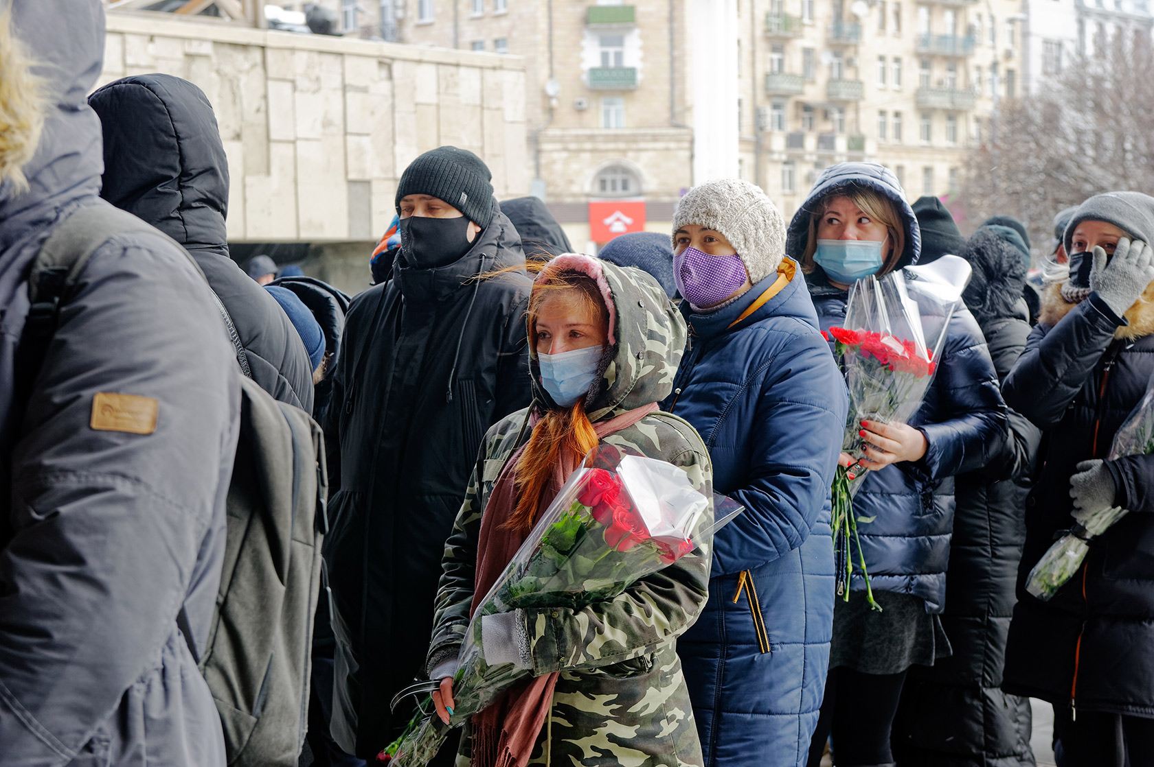Волонтеры и охранники мэра то и дело забирают цветы, которые приносят и приносят, на улицу. Там их сгружают в грузовики и увозят. К театру стоит очередь примерно в 700 метров, которая тянется через сад Шевченко и заканчивается почти у самой станции метро Университет. У дороги припаркованы автозаки.