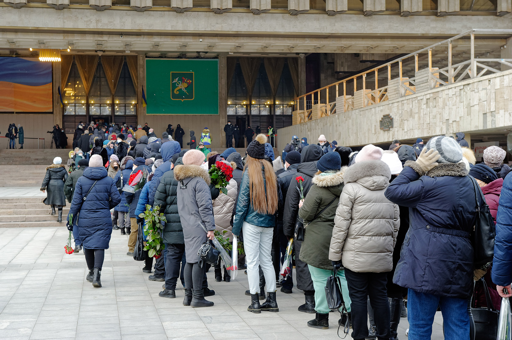 В очереди девушка с пышным букетом роз рыдает навзрыд, наверх по ступенькам несут венок от Александра Грановского, который в прошлом году баллотировался на досрочных парламентских выборах, но не прошел и уехал в Израиль. Возложив цветы, друзья мэра и чиновники тянутся к выходу. Но простых симпатиков здесь намного больше.