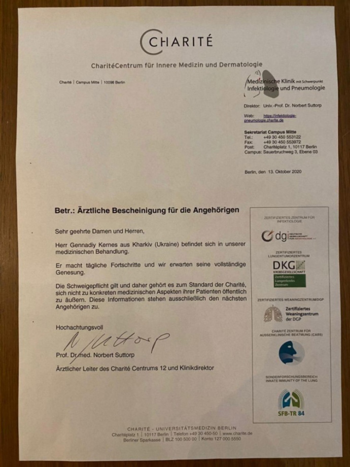 Еще через неделю, 24 сентября, пасынок Кернеса Родион Гайсинский опубликовал в Instagram фотографию медицинского заключения из "Шарите". В справке с подписью директора было написано, что пациент "прогрессирует каждый день" и в клинике "надеются на его полное выздоровление".