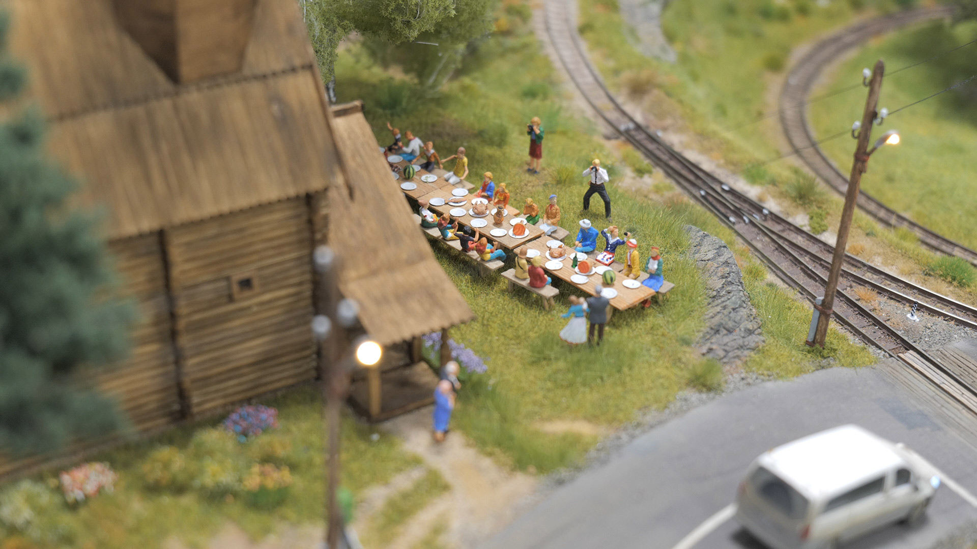 Чем больше рассматриваешь этот небольшой макет, тем больше замечаешь новых деталей. Вот, например, дом лесника. Его жена кормит кур, в то время как мужчина отдыхает на лавке. Вот – скалолаз, зависший на скале.