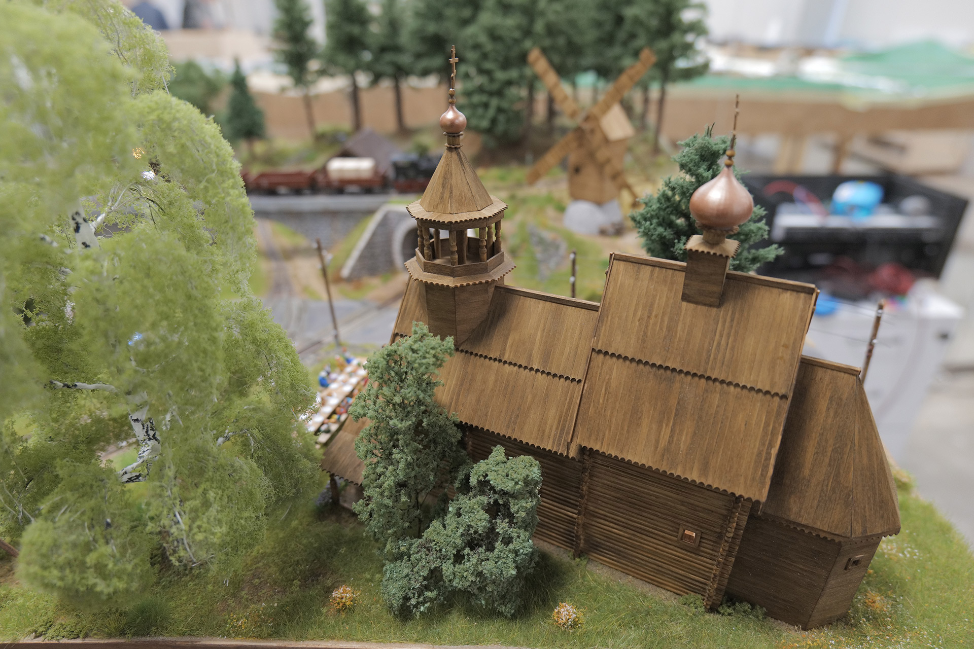 О своем увлечении, ставшим любимой работой, Павел рассказывает, стоя у презентационного стенда размером метр на метр. Нажимая на кнопку сбоку, он включает освещение, приводит в движение два поезда на узкоколейке и наполняет бутафорный мир звуками.
