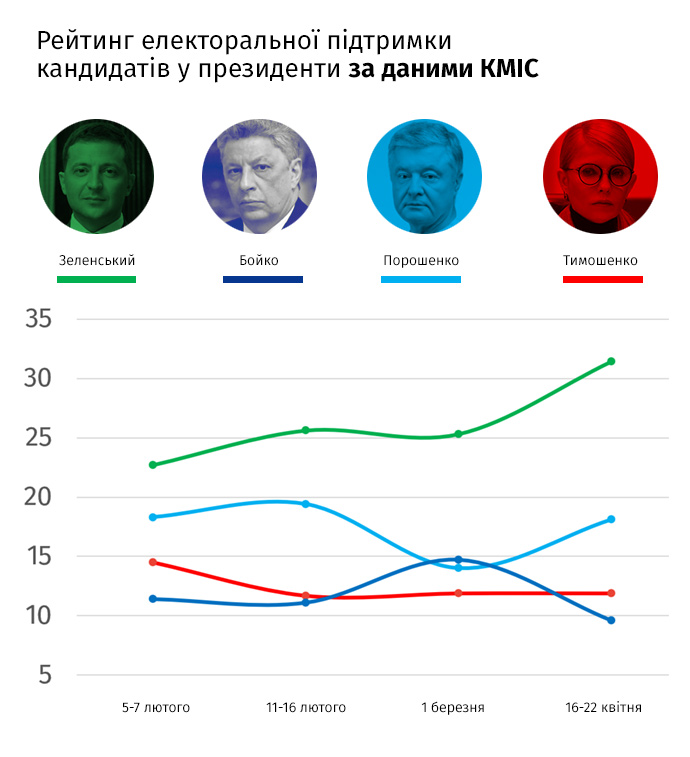 "Але якщо подивитись на ситуацію глобально, то уся трійця конкурентів Зеленського завмерла на певних плато. Порошенку далі складно рости, він на першому турі тоді вибрав свій максимум. Бойко насправді почав падати ще з літа минулого року. Коли у Зе закінчився різкий спад, у Бойка почались проблеми. Тимошенко зараз трохи підросла, але це теж навряд чи тривала тенденція", – додає співрозмовник.