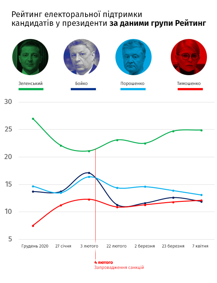 "На початок лютого 2021 року партія "Слуга народу" дійшла до моменту, коли ми в опитуваннях фіксували, що вона програє ОПЗЖ. Рейтинги Зеленського так само йшли донизу. Хіба що він як кандидат залишався лідером із показником 20-21%. Це були буквально перші числа лютого, якраз перед санкціями", – розповідає Антипович.