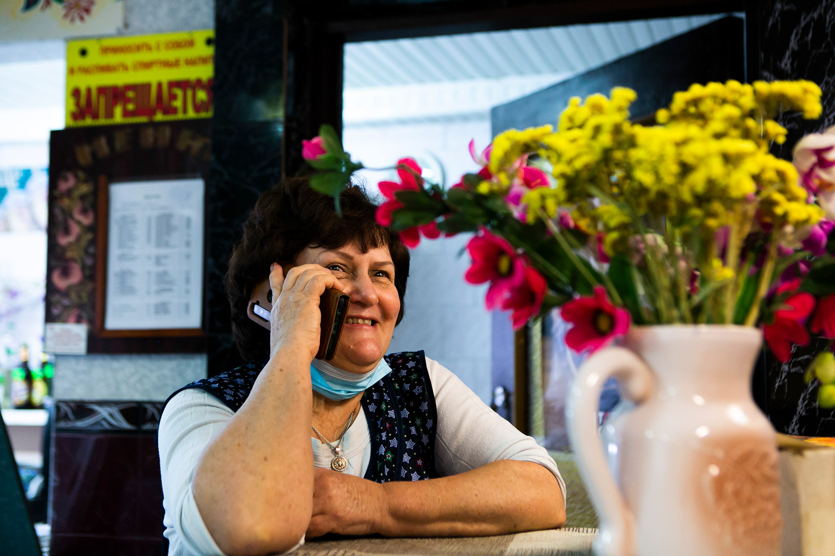 "Она у меня талантливый товарищ, петриковкой начала заниматься в 17 лет, — говорит руководительница заведения. — Раньше на столах стояло меню, сейчас из-за карантина не разрешаю".
