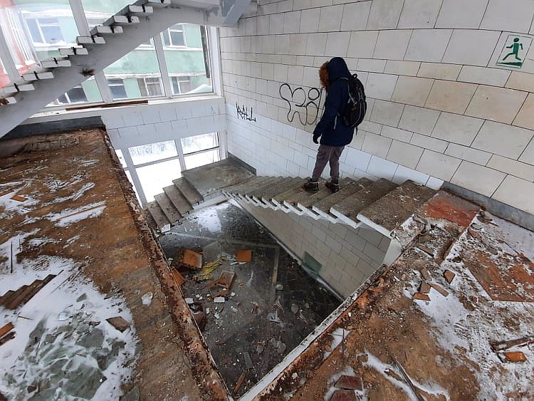 Пустые коридоры и глазницы окон. Хруст битых стекол под ногами.
