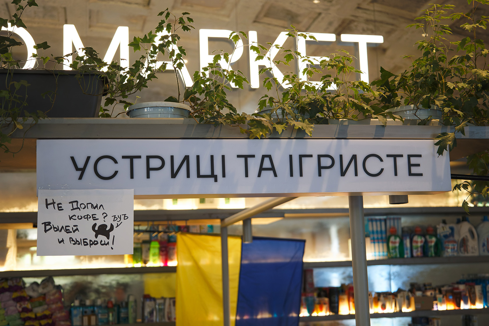 Над колишнім баром видніється вказівка для російського корабля. А за стійкою "Устриці та ігристе", прикрашеною синьо-жовтими прапорами, нині фасують шампуні та серветки.