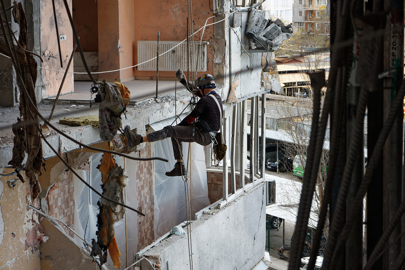 Ми зустрічаємо тут айтішника Данила, який у мирний час займався в альпіністському клубі. Зараз – допомагає на висоті прибирати залишки скла у розбитих вікнах. Поруч – чоловік у тільнику, судновий електромеханік Дмитро. Він у відпустці та прибирає будівельне сміття.