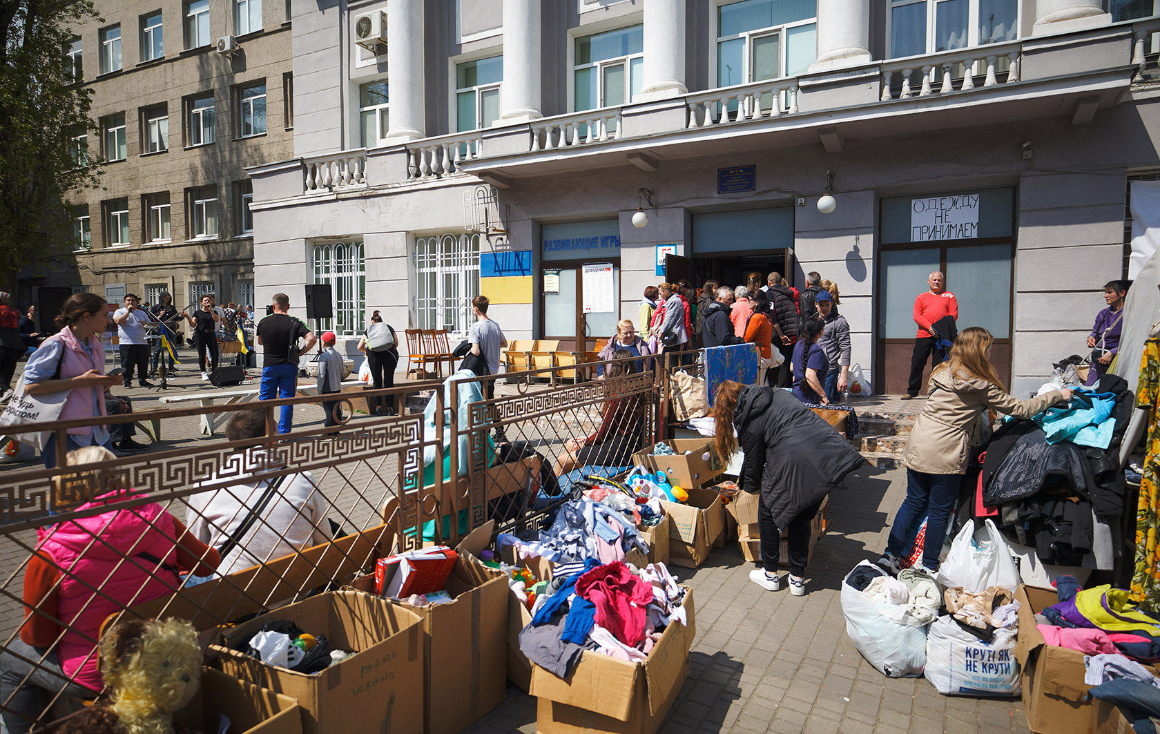 Але життя навколо триває. З вікон колишніх квартир видно дітей, які граються на майданчику у ЖК. Втомлені обличчя волонтерів розпливаються у посмішках від "дякую за роботу". Після важкого робочого дня тут розповідають анекдоти.