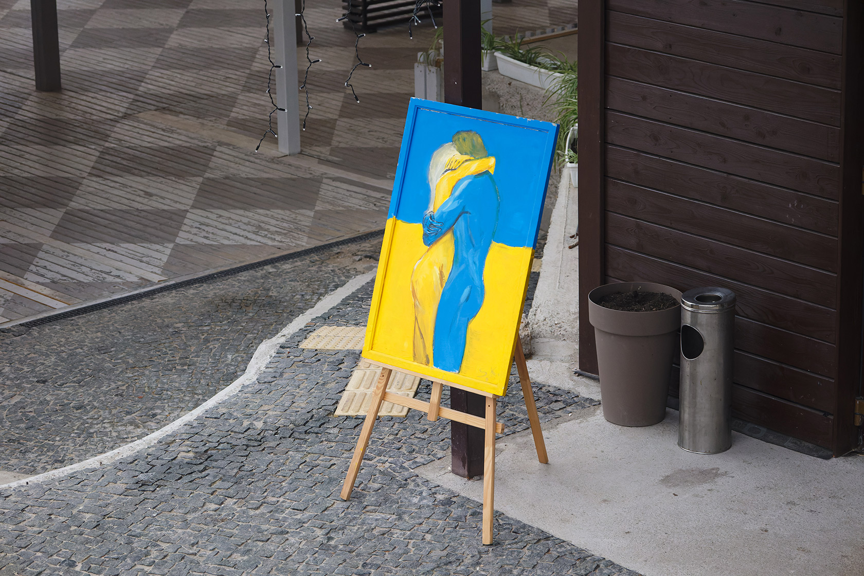 Зараз жовто-сині прапори в Одесі на кожному кроці: на ресторанах, дверях модних бутиків, біля пам'ятника Пушкіну та просто на будинках. На бетонних перегородках – відомі написи про російський корабель. На старовинній кенасі в центрі – плакат "Если маму кто-то тронет, того мама похоронит".