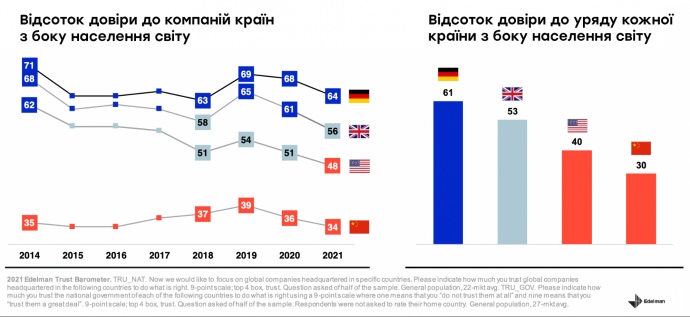 Сполучені Штати, країна, яка колись була взірцем для наслідування всього пострадянського простору, опустились до найнижчих показників довіри з боку народів світу, наблизившись за цим показником до Китаю (за даними Edelman).
