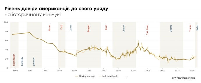 Починаючи з 60-х років, уряд США втратив довіру навіть серед власного населення. Наразі він застряг на історичному мінімумумі, впавши з близько 80% довіри у 60-х до близько 20% на сьогодні, за даними PEW.