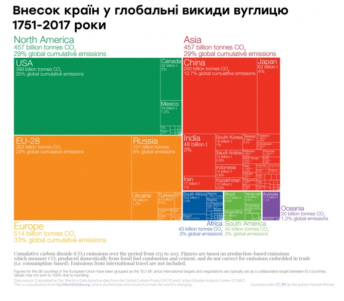 Необмежені викиди дали можливість "дешевого" збагачення найбагатших країн протягом століть, що іншим, відстаючим країнам, вже не доступно сьогодні. Починаючи з 1751-го року до 2017-го Сполучені Штати викинули в атмосферу 25% усього обсягу вуглекислого газу, виробленого за цей період людством. Європейський союз згенерував за цей же період 22% усіх викидів, натомість Китай і Росія згенерували всього 12,7% та 6%. Усі інші країни світу забруднили атмосферу незрівнянно менше за весь час свого існування.