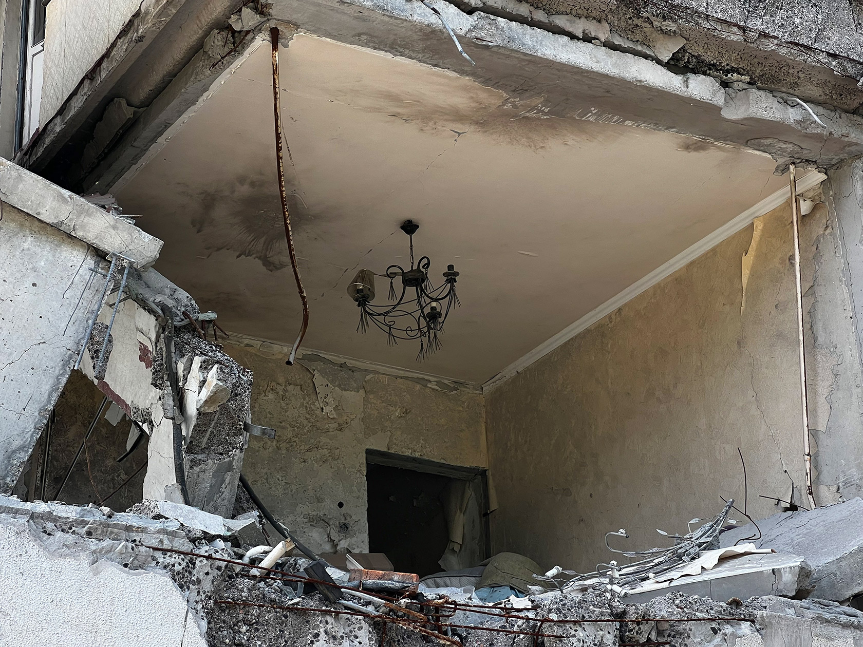 (Стреляли), я так понимаю, откуда-то с Бобровки [село за Окружной дорогой – "УП"]. Непонятно – прямой танк или какой-то снаряд залетел, потому что пробило все и вылетело с балкона. Пожара не было, стены повалило, разбило все. На технике, мебели плиты лежат".