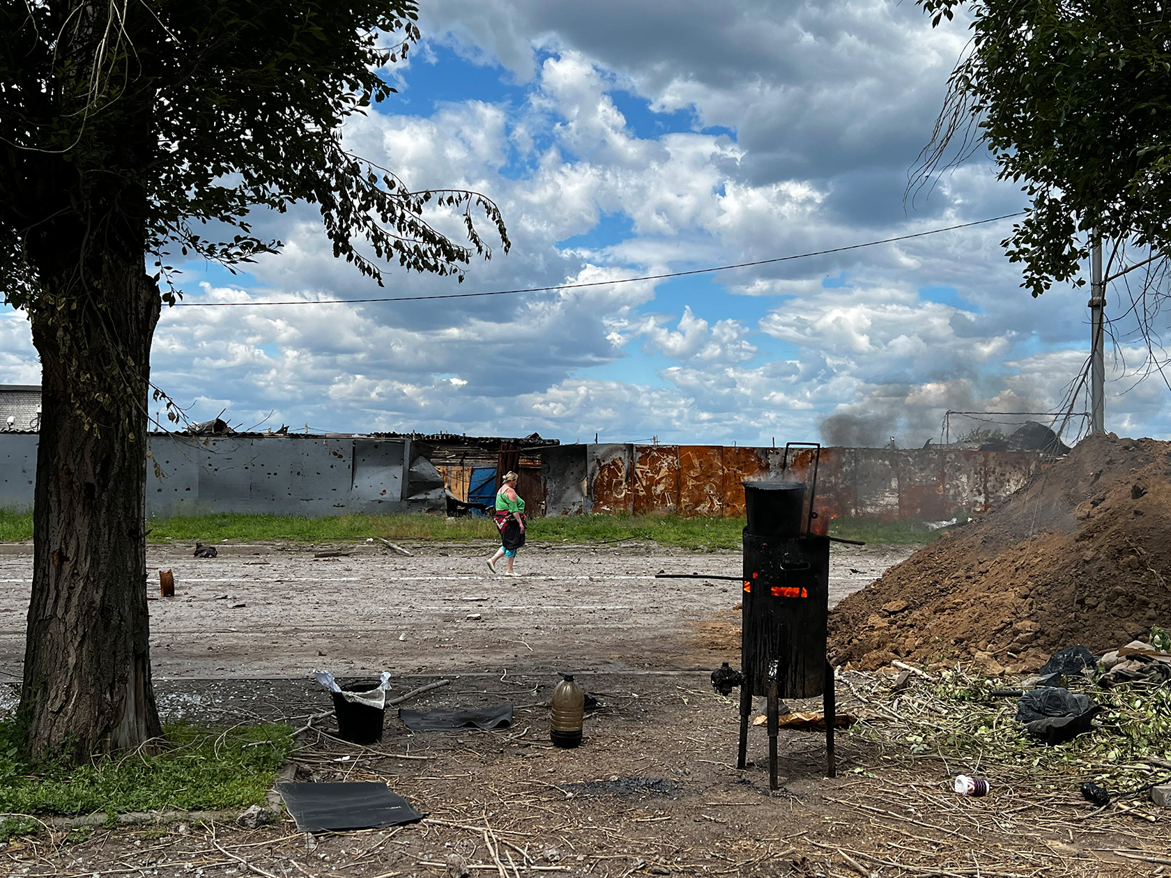 Пытаясь осознать масштаб трагедии, которую пережил каждый из местных жителей, возвращаемся к машине. Коммунальщики продолжают мести дорогу, на обочине варят смолу в буржуйке, четверо мужчин несут в неизвестном направлении холодильник.