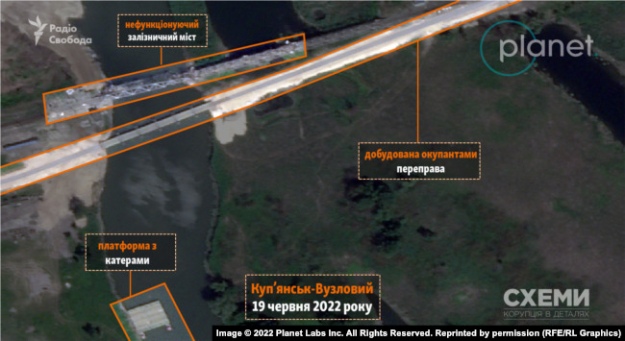 Супутниковий знімок від 19 червня, опублікований журналістами "Радіо Свобода", свідчить, що російські військові добудували понтонну переправу через річку Оскіл біля тимчасово окупованого селища Куп’янськ-Вузловий Харківської області й можуть її використовувати.