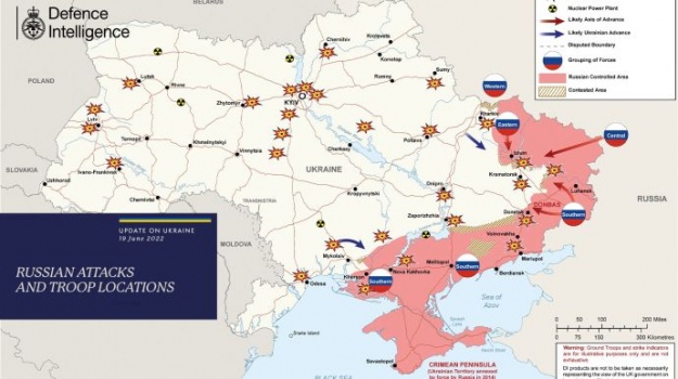 | МАПА ВІЙНИ ВІД БРИТАНСЬКОЇ РОЗВІДКИ СТАНОМ НА 19.06.2022 |