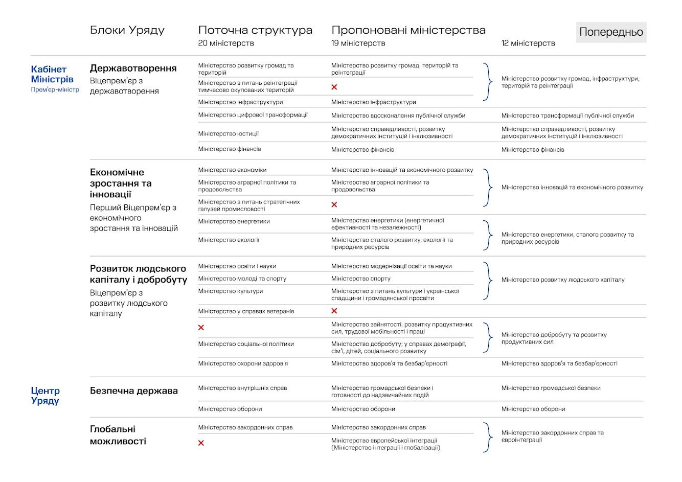 Наприклад, пропонується скоротити кількість міністерств із нинішніх 20 до 12, об'єднавши, наприклад, Мінрегіон з МінТОТ і Мінінфраструктури, а Мінмолодьспорту – з Мінкультом та Міносвіти тощо.