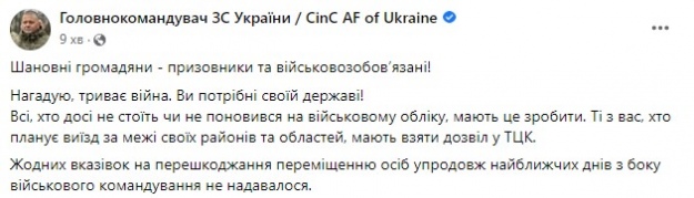Генеральний штаб Збройних сил України розробив Порядок надання дозволу на виїзд за межі місця проживання чи перебування громадянам України, які перебувають на військовому обліку, під час воєнного стану: він може діяти від 30 днів до року.