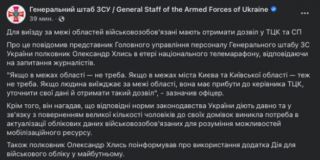 Генштаб дав ще одне роз'яснення про контроль пересування військовозобов'язаних