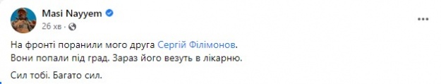 Про це на фейсбук-сторінці пише адвокат та військовий Масі Найєм, якого нещодавно також поранили на фронті.