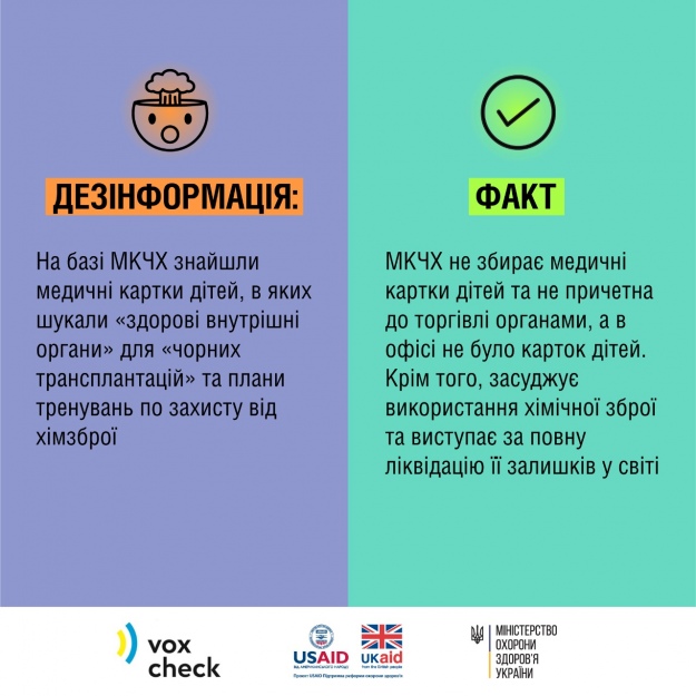 Міністерство охорони здоров'я спростовує російські міфи про діяльність Міжнародного Комітету Червоного Хреста (МКЧХ) в Маріуполі, вакцинування та хімічну зброю.
